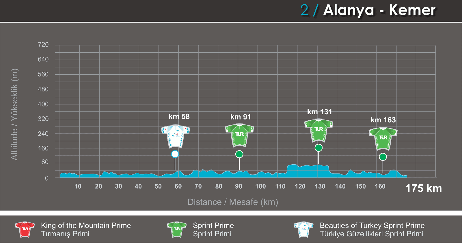 Yarın geçilecek Alanya-Kemer etabı da düz bir profile sahip. Bu nedenle sporcuların bitişe topluca geleceklerini tahmin etmek güç değil. Fakat etabın düz olması nedeniyle 5-10 kişilik bir kaçış grubu oluşması halinde yarışı sürpriz bir isim de alabilir.